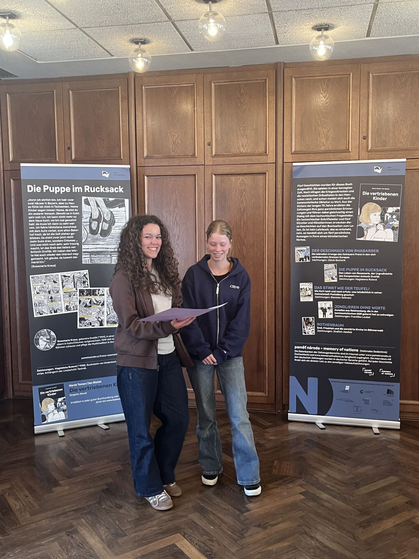 Im Rahmen der Vorbereitung unserer Begegnungsreise mit dem Gymnasium Trutnov/Trautenau im Juni besuchte das P-Seminar Geschichte von K. Flöter die aktuelle Ausstellung des Stadtarchivs zur Graphic Novel „Die vertriebenen Kinder“ der tschechischen Autoren Marek Toman und Jan Blažek, die noch bis zum 6. Juni im Greisingsaal in der Neubaustraße zu sehen ist. Mit Unterstützung des tschechischen Kultusministeriums und des deutsch-tschechischen Zukunftsfonds wurden im Balaena-Verlag fünf Zeitzeugenberichte über die Vertreibung der deutschen Bevölkerung aus der Tschechoslowakei nach dem Zweiten Weltkrieg aus kindlicher Perspektive herausgegeben, die in der tschechischen Originalausgabe Odsunuté děti den tschechischen Jugendbuchpreis erhielt. Nach einer Begrüßung durch Frau Haberkern, Initiatorin der Ausstellung von der Stiftung Kulturwerk Schlesien, setzten sich die Teilnehmer des P-Seminars mit den Biographien sowie der künstlerischen Gestaltung der Graphic Novels auseinander und präsentierten ihre Ergebnisse. Alle waren sich einige, dass die Ausdruckskraft der Comics den Erlebnissen der Kinder eine besondere Intensität verleiht. Eine sehenswerte Ausstellung und ein Stück Erinnerungsarbeit!