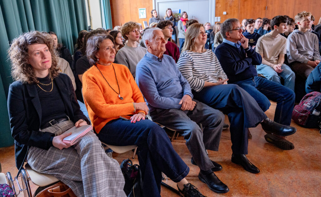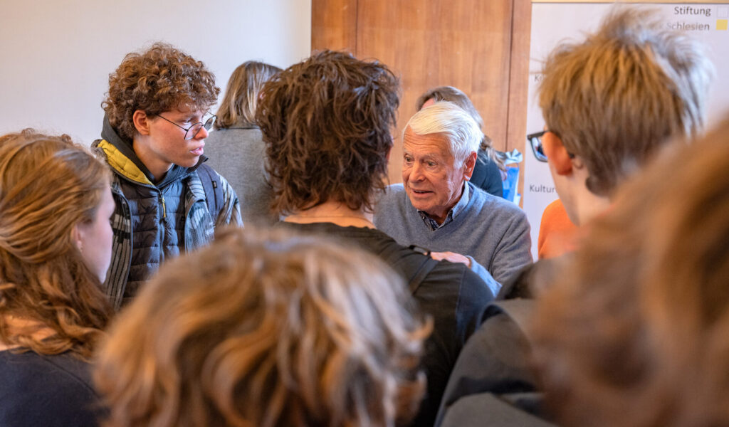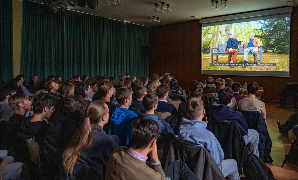 Eine sehr dichte und ergreifende Atmosphäre prägte ein Zeitzeugengespräch mit den Schülerinnen und Schülern der Q12 und der 11a,b. Protagonisten des zunächst gezeigten Films waren Jürgen Hempel und Jerzy Podlak, die als Jugendliche die Festung Breslau 1945 überlebt haben. Sie lernen sich erst nach vielen Jahren kennen und sie berichten im Film über das Leben in Breslau/Wrocław während des Krieges und darüber, wie der Krieg ihr Leben beeinflusst und für immer verändert hat.  Im Anschluss an die Vorführung ging Jürgen Hempel (*1932) unterstützt von der polnischen Regisseurin Joanna Mielewczyk auf die vielen Fragen der Schüler ein. Die Veranstaltung fand in Kooperation mit dem Kulturwerk Schlesien statt.