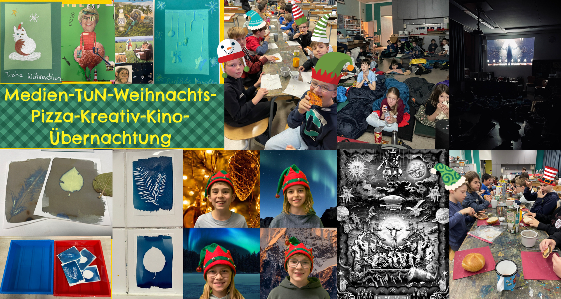 Einen ganz besonderen Einstieg in die schulische Vorweihnachtszeit (= Wirsi-Weihnachtsfrieden) fandendie Medien-TuNies der 5. Klassen am vergangenen Freitag. Angeleitet von Frank Findeiß, Sabine Blum-Pfingstl, Kadriye Erat und Caroline Müller tauchten sieein in die Welt des analogen Fotografierens(Cyanografie), der digitalen Tricks (Greenscreen) und der klassischen Bastelei mit Stift und Schere. Nachdem alle mit den verschiedenen Methoden (Schere, Collage, analog/digital Fotografie) eine eigene Weihnachtskarte gestaltet hatten, ging der kreative in den kulinarischen Teil über – mit der Ankunft der Party-Pizzen (erneut klarer Favorit: Pizza Margherita) wurde der Abend eingeläutet.